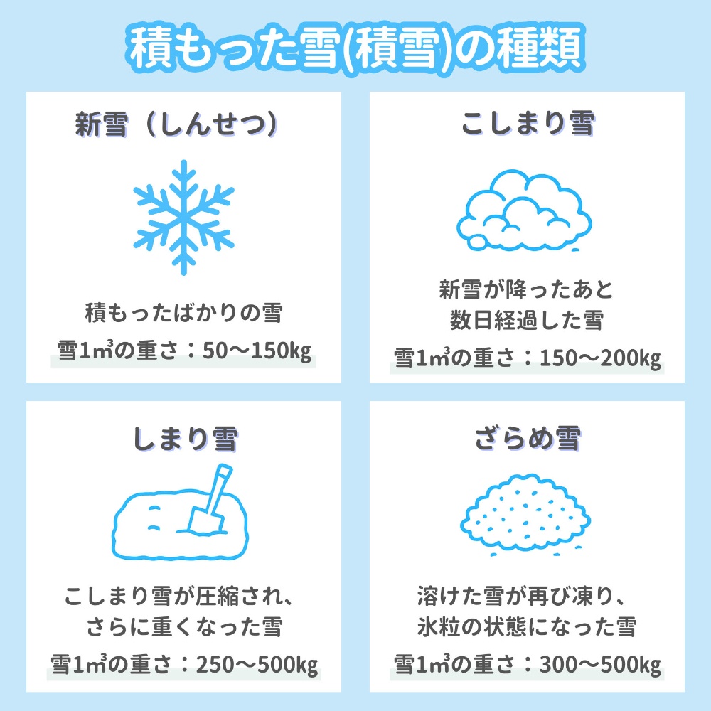 積雪は、時間が経過するにつれて次第に重くなり、状態も変化していきます。積もってからの時間経過によって、以下の4種類に分類されます。